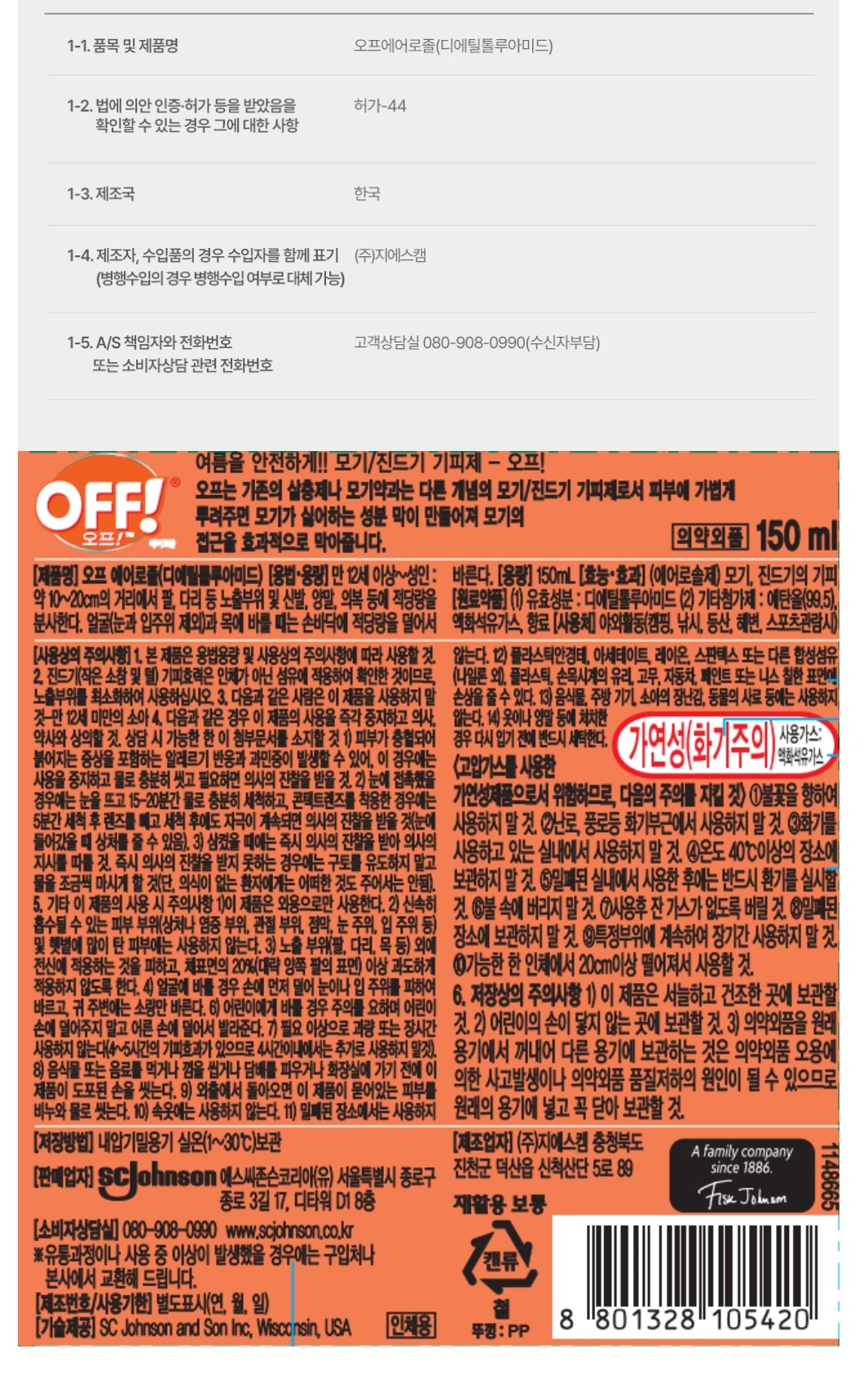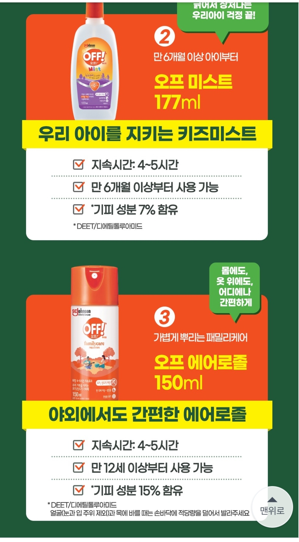 오프 에어로졸 DEET 12세 미만 사용금지, 강력한 효과, 에어로졸형