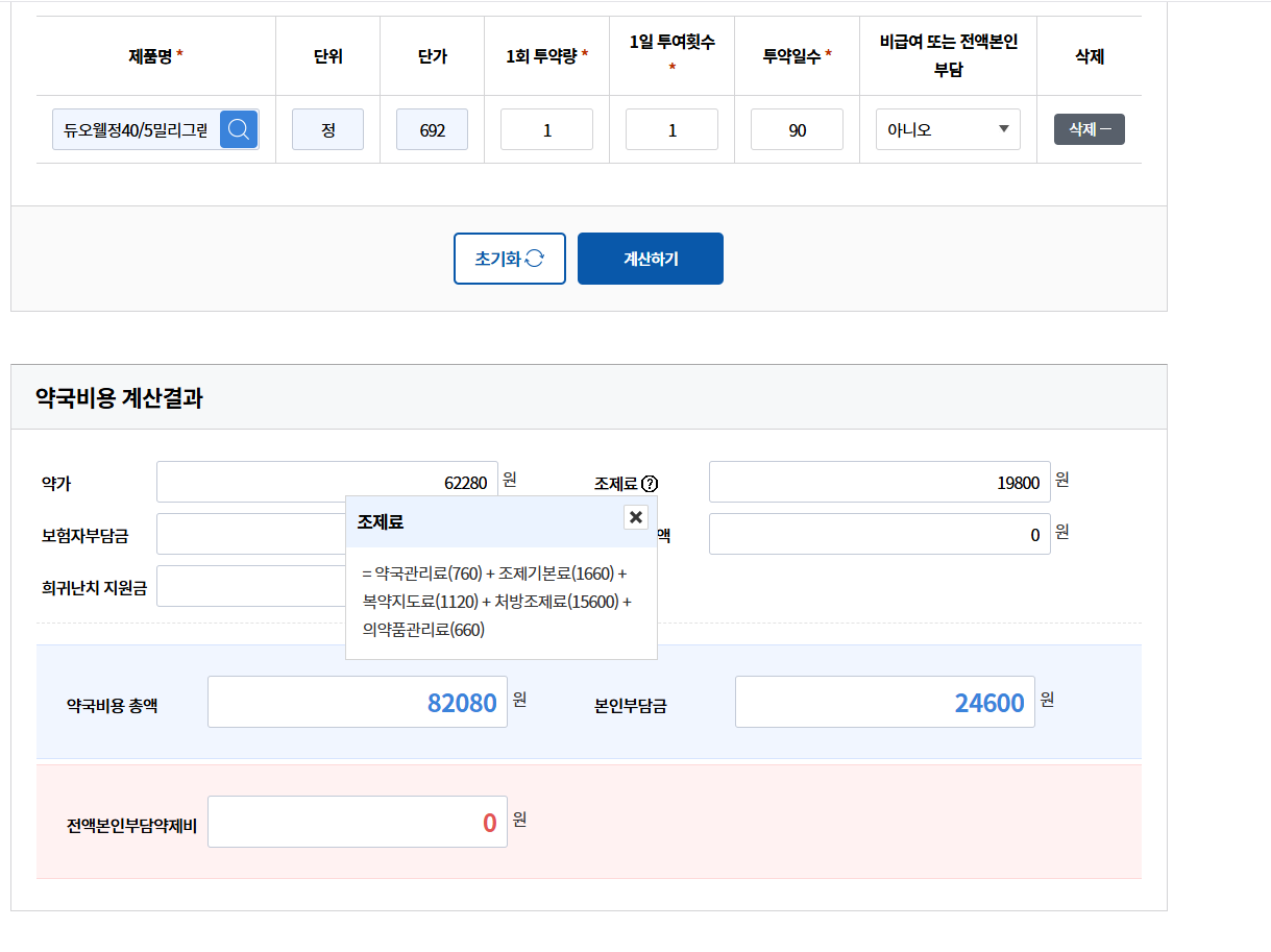 조제료= 약국관리료(760) + 조제기본료(1660) + 복약지도료(1120) + 처방조제료(15600) + 의약품관리료(660)