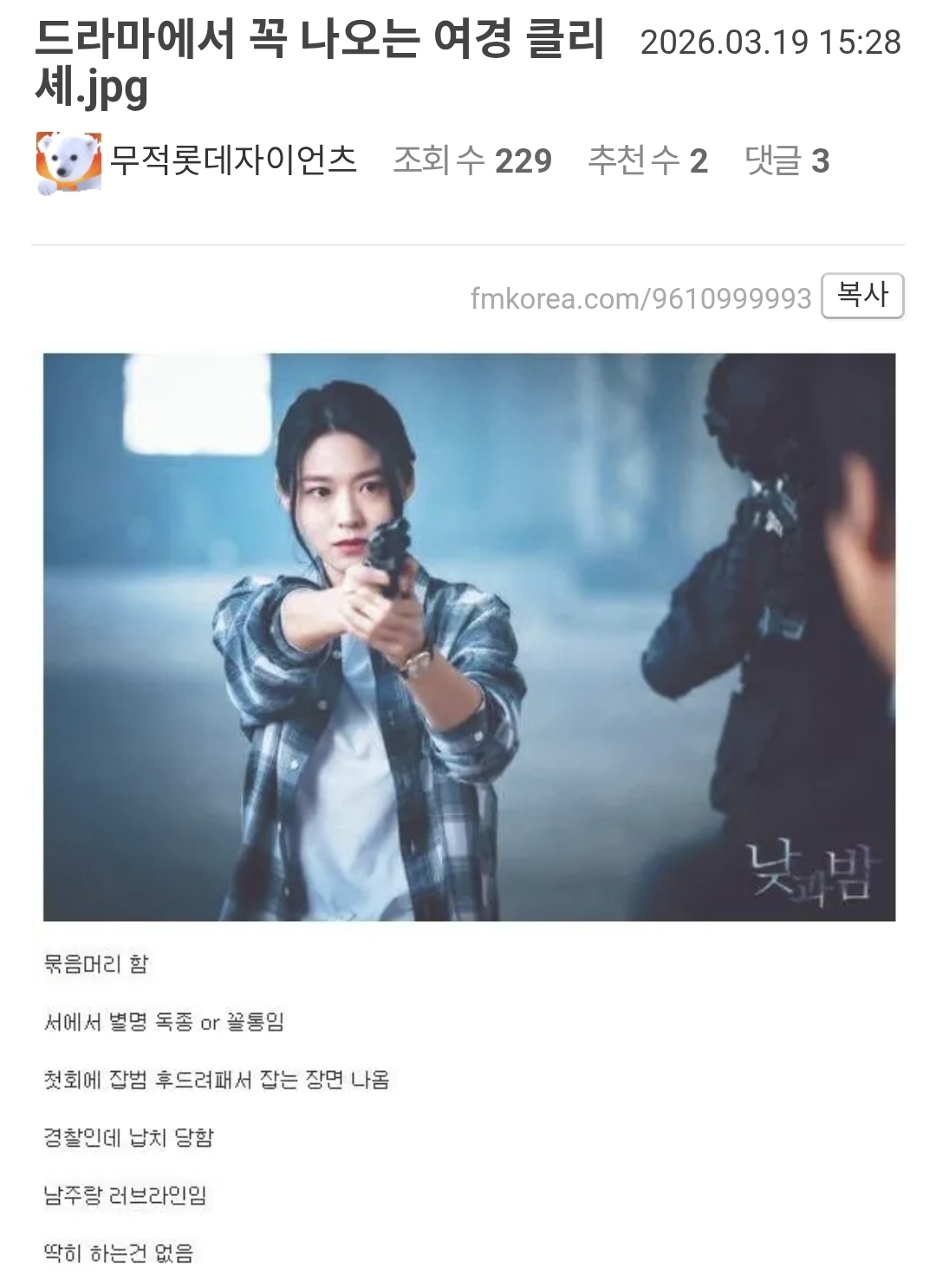 카테고리 없음 펌]드라마에서 꼭 나오는 여경 클리셰 by 트랜크스 2026. 3. 19. 반응형 현실에선 뒷짐지고 어슬렁 어슬렁 범인 근처에서는 오또캐 시전 728x90 반응형 공유하기 게시글 관리 따불 댓글