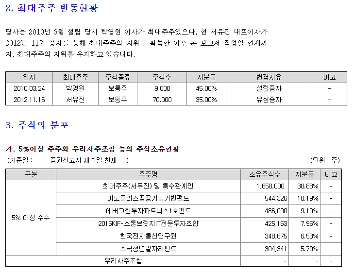 대주주 지분이 적다. 2010년 설립당시에는 박영원이사가 최대주주였음.