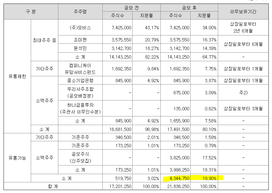 유통가능물량 적절(19%,430만주)