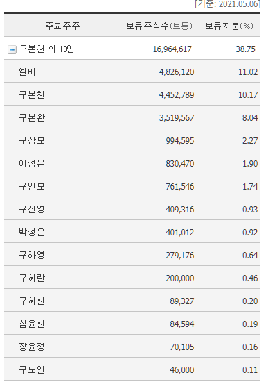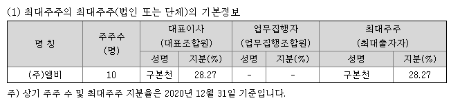 LG창업주 구인회 손자->구본천(엘비인베스트먼트 부회장)이 엘비의 최대주주