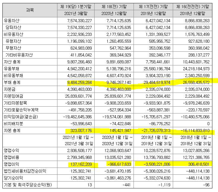 | 순이익 | -5,332 (백만원) | 자본금 | 4,390 (백만원) |