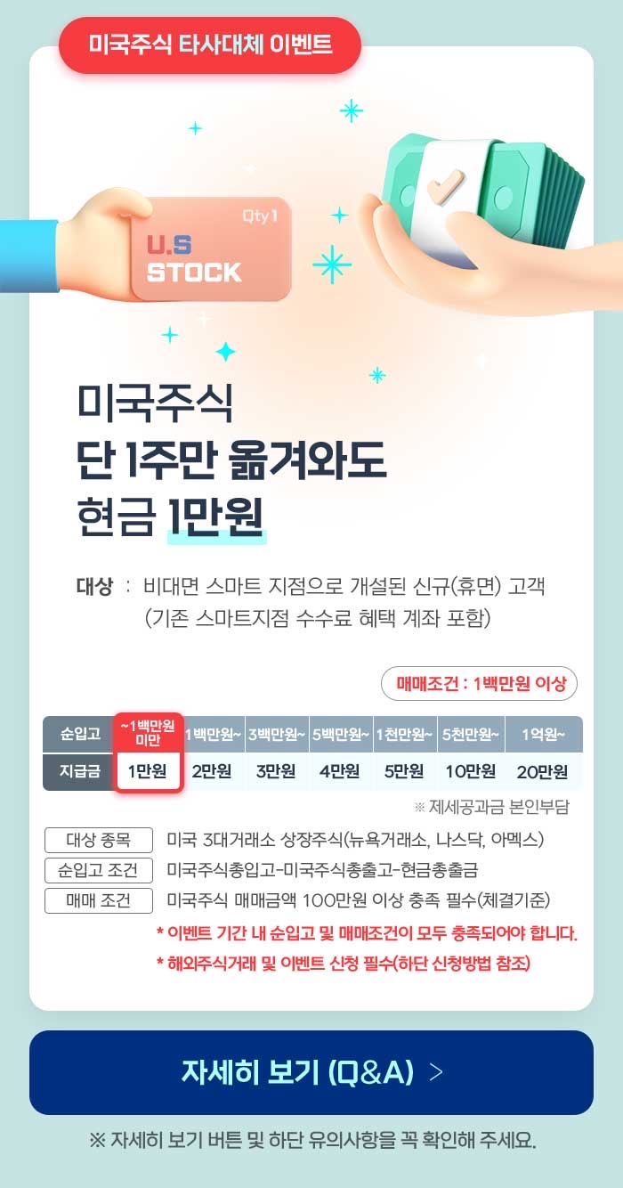 해외주식 타사대체입고 이벤트도 한다. 1천만원 이상 입고후 100만원 이상 거래시 9/15일 5만원주니께