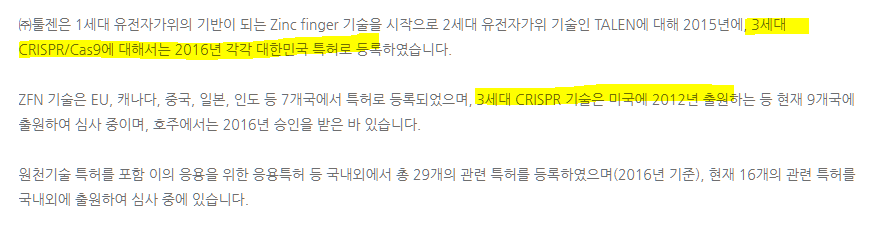 ->미국 특허청으로부터 제3세대 유전자 가위 기술로 평가되는 크리스퍼 카스나인(CRISPR Cas9)의 원천기술 특허에 대해 등록 허가받음