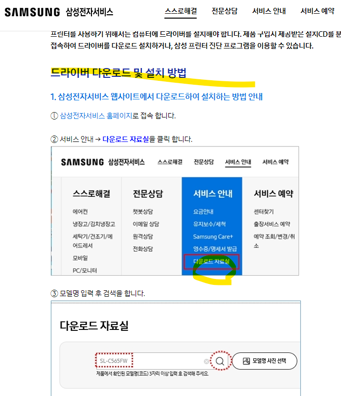 아래 삼성 support 사이트에서 다운받아도 된다. 프린터 설치파일도 아래 링크에서 다운받도록!!