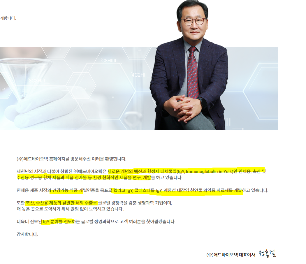 면역물질이 함유된 달걀 난황 항체(IgY)를 활용해 축산용 항체의약품, 보조사료 등을 판매 중