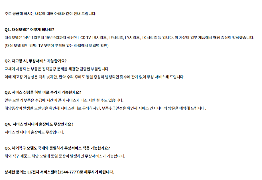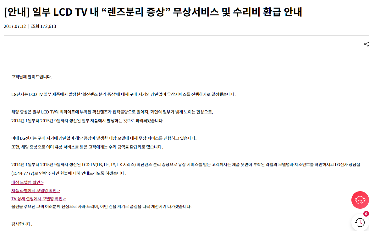 [안내] 일부 LCD TV 내 “렌즈분리 증상” 무상서비스 및 수리비 환급 안내 > 공지사항 | LG전자 고