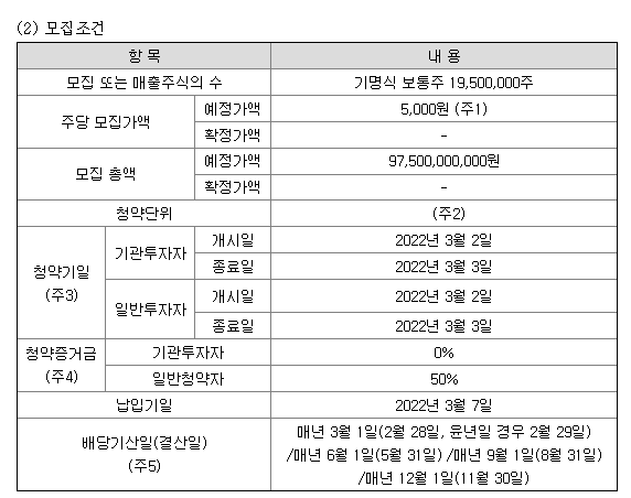 | 주요일정 | 공모청약일 | 2022.03.02 ~ 2022.03.03 | ||