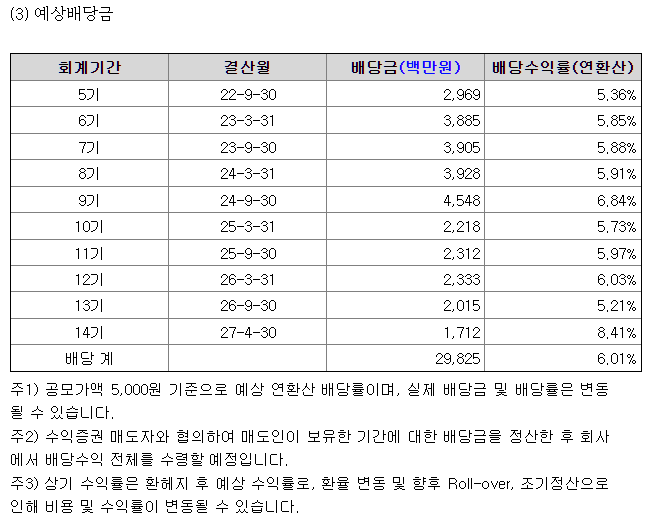 운용 기간을 2027년까지 약 5년 가정했을 때 연 평균 배당수익률은 약 6% 수준이라고 주장함.
