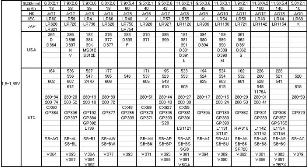 | AG1 | LR60 | SR60,LR321,LR320 SR621SW,SR321W |