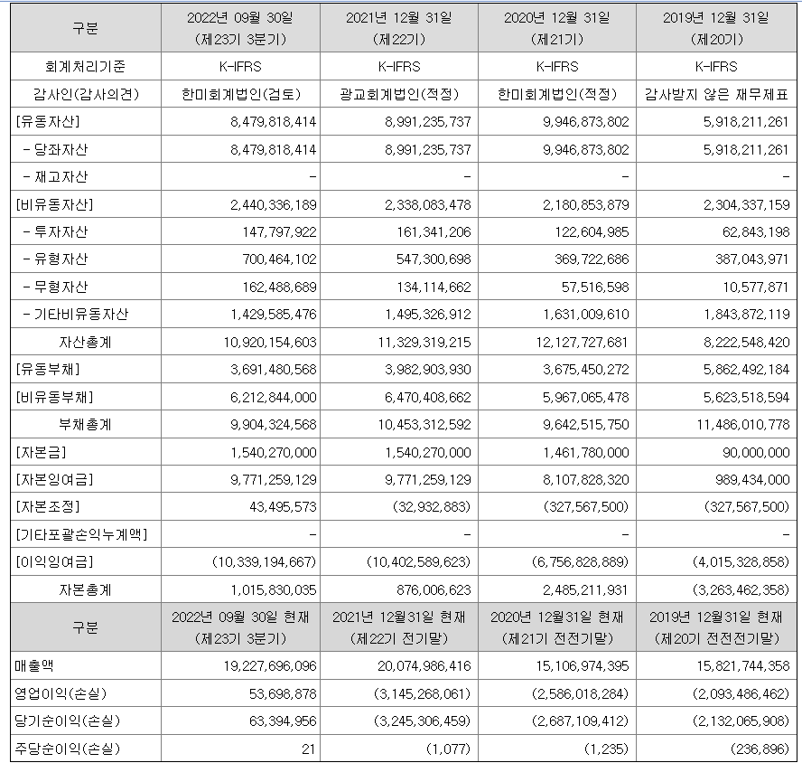| 순이익 | -3,245 (백만원) | 자본금 | 876 (백만원) |