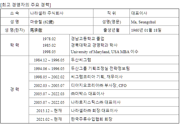 나라로지스틱스는 마승철 나라셀라 회장이 최대주주