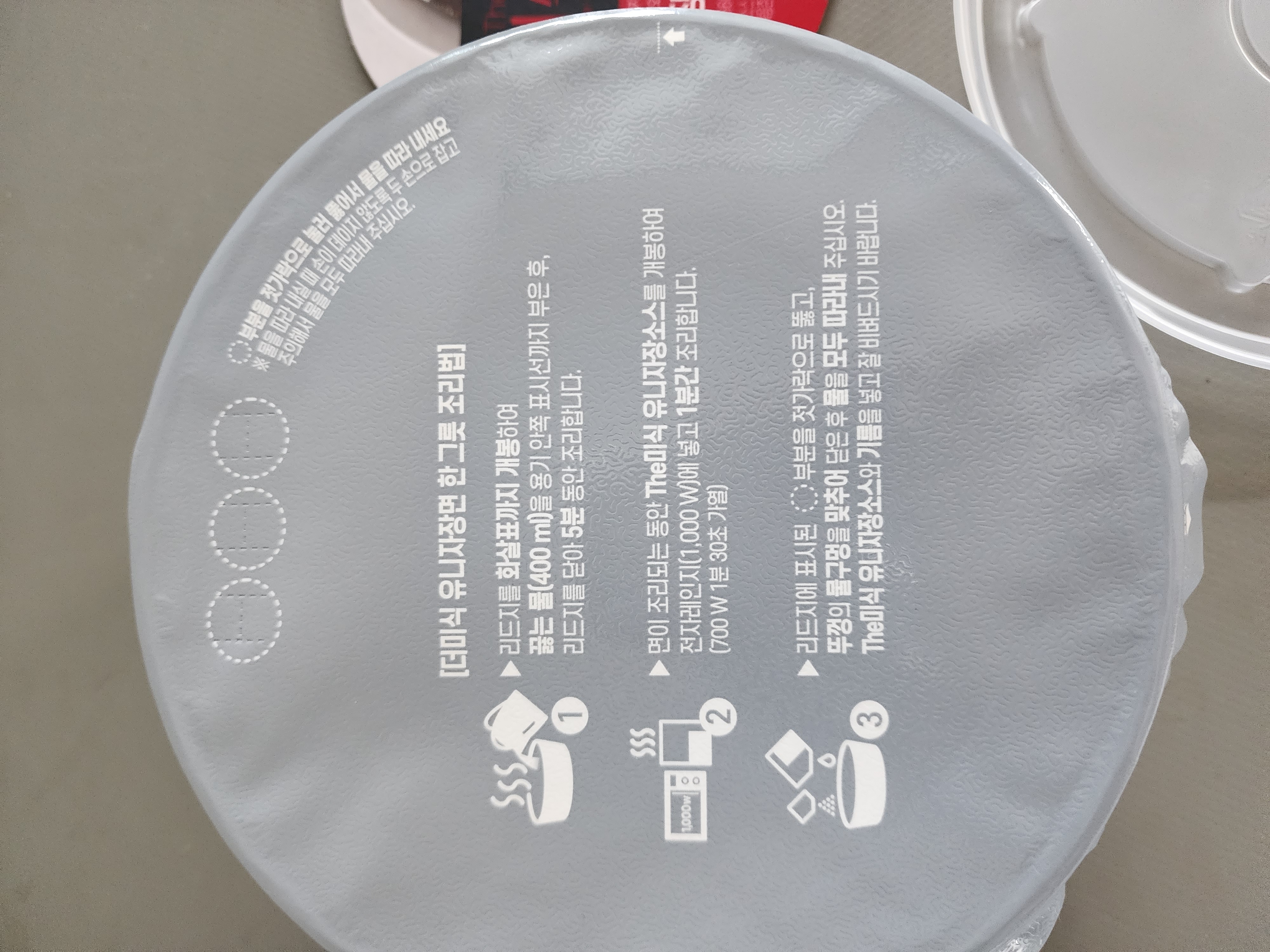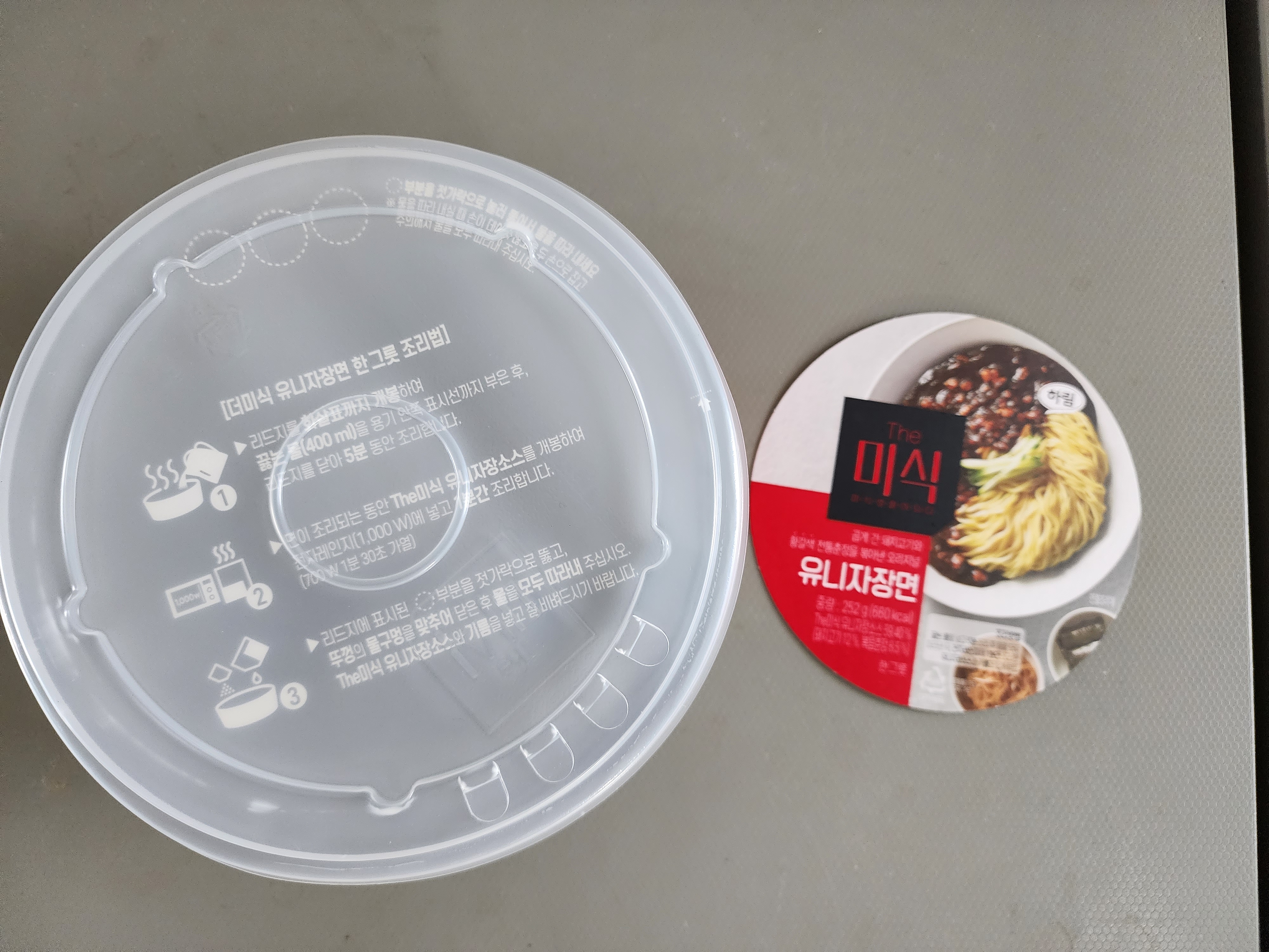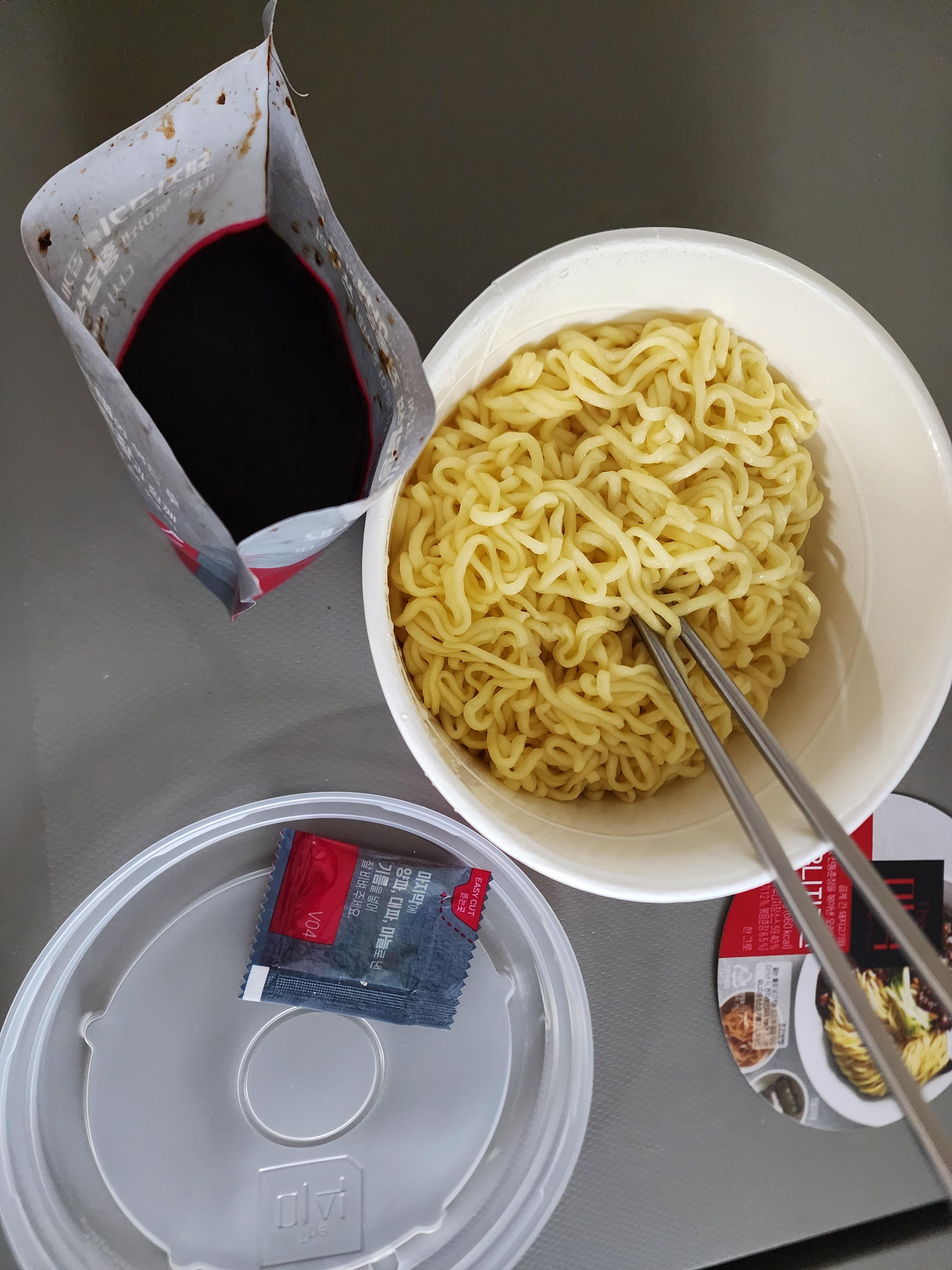 귀찮게 면은 끓는물에 5분담그고 짜장소스는 뜯어서 전자렌지 돌리란다. 뜯는데 소스 튐