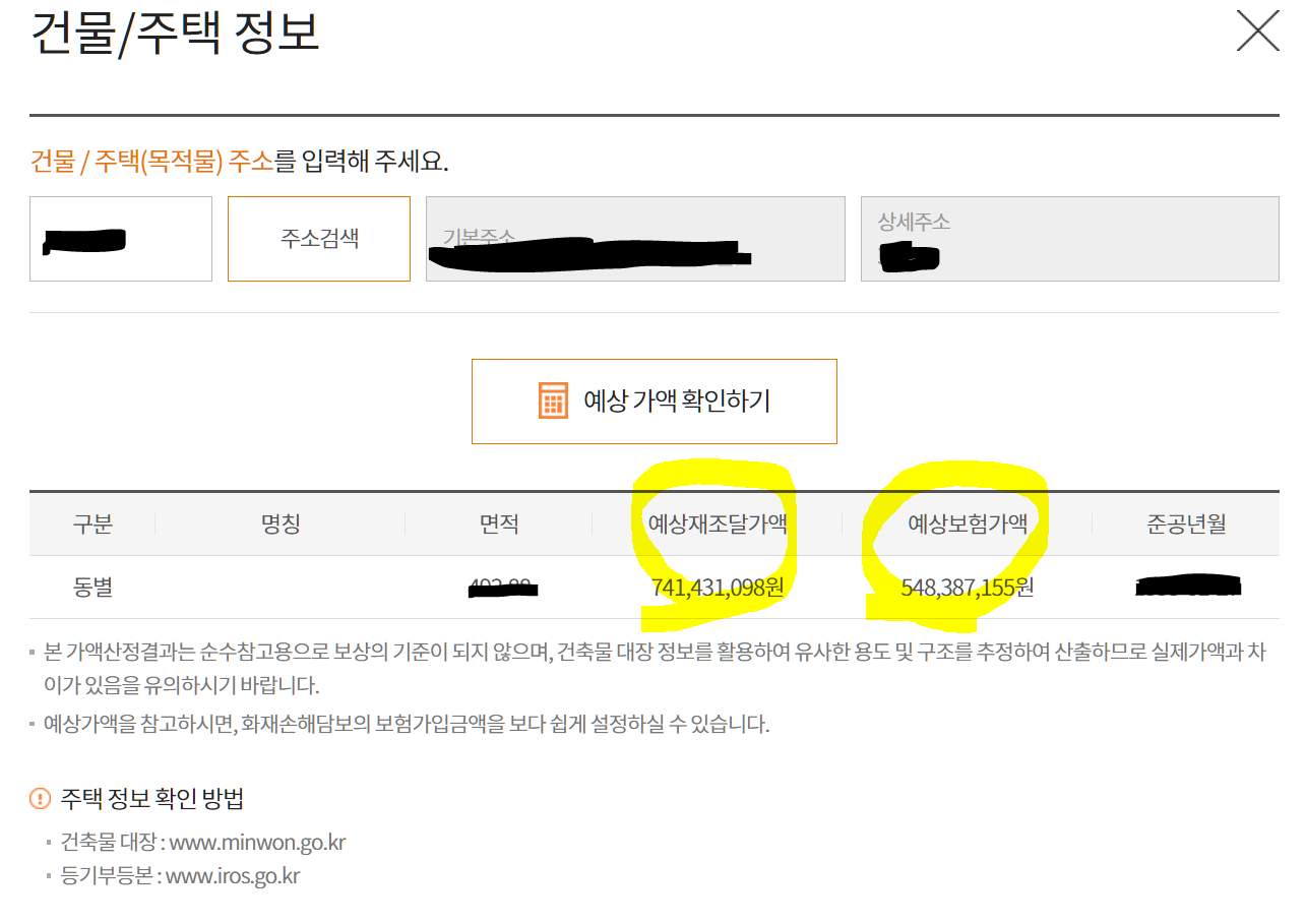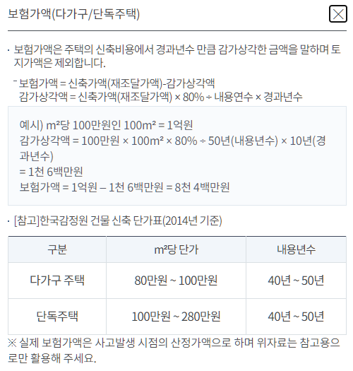 보험가액은 계산이 복잡하니 현대해상다이렉트 주택화재보험에서 보험료 계산시 주소만 넣으면 재조달가액(건물신축단가에따른 계산액)과 감가상각을 뺀 보험가액을 계산해준다.(대략 이정도에서 보험가입금액을 정해야한다)