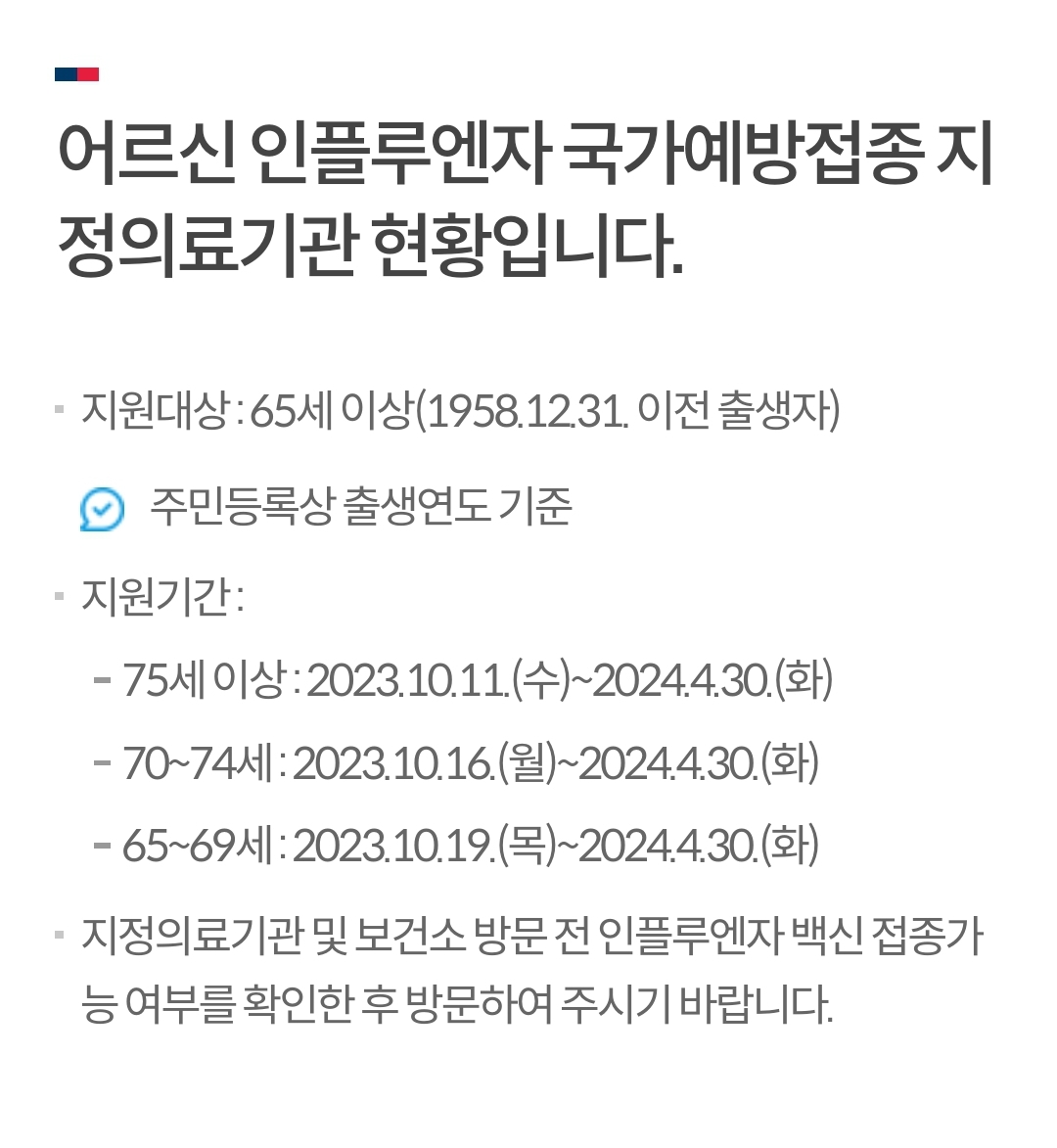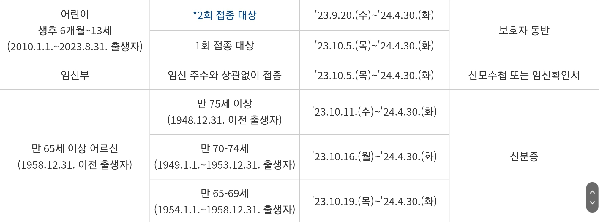 어린이의 경우, 2회 접종이 필요하며, 2회 접종 간격은 4주 이상으로 권고됩니다. 임신부의 경우, 임신 주수와 상관없이 접종이 가능합니다. 어르신의 경우, 75세 이상은 10월 11일부터, 65~74세는 10월 16일부터 접종이 시작됩니다.
