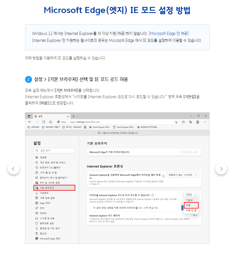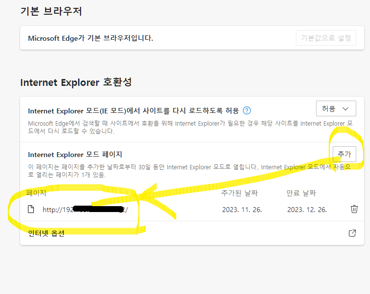 IE 모드를 허용한다음에 내 사이트를 추가해야 IE모드로 열수가 있다.