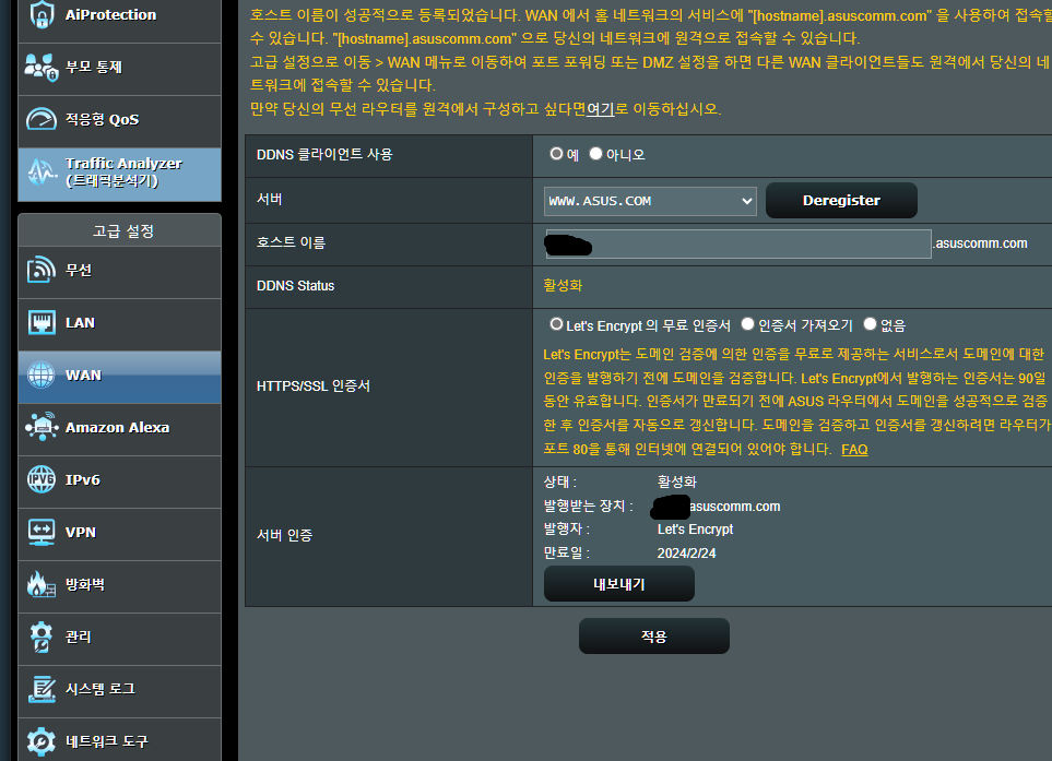 내가 설정한 서버 명이 있을것이다. 아래 0000.asuscomm.com ->이게 DDNS주소다.