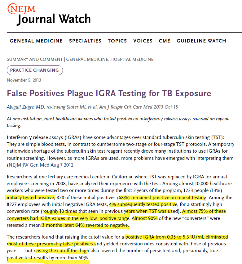 따라서 아래 미국 호흡기 및 중환자 의학 저널(American Journal of Respiratory and Critical Care Medicine)제188권8호에 실린 논문을 보면 대략 30%의 위양성환자가 있기 때문에 IGRA의 진단기준을 현재보다 높이자 뭐 이런 논문입니다.