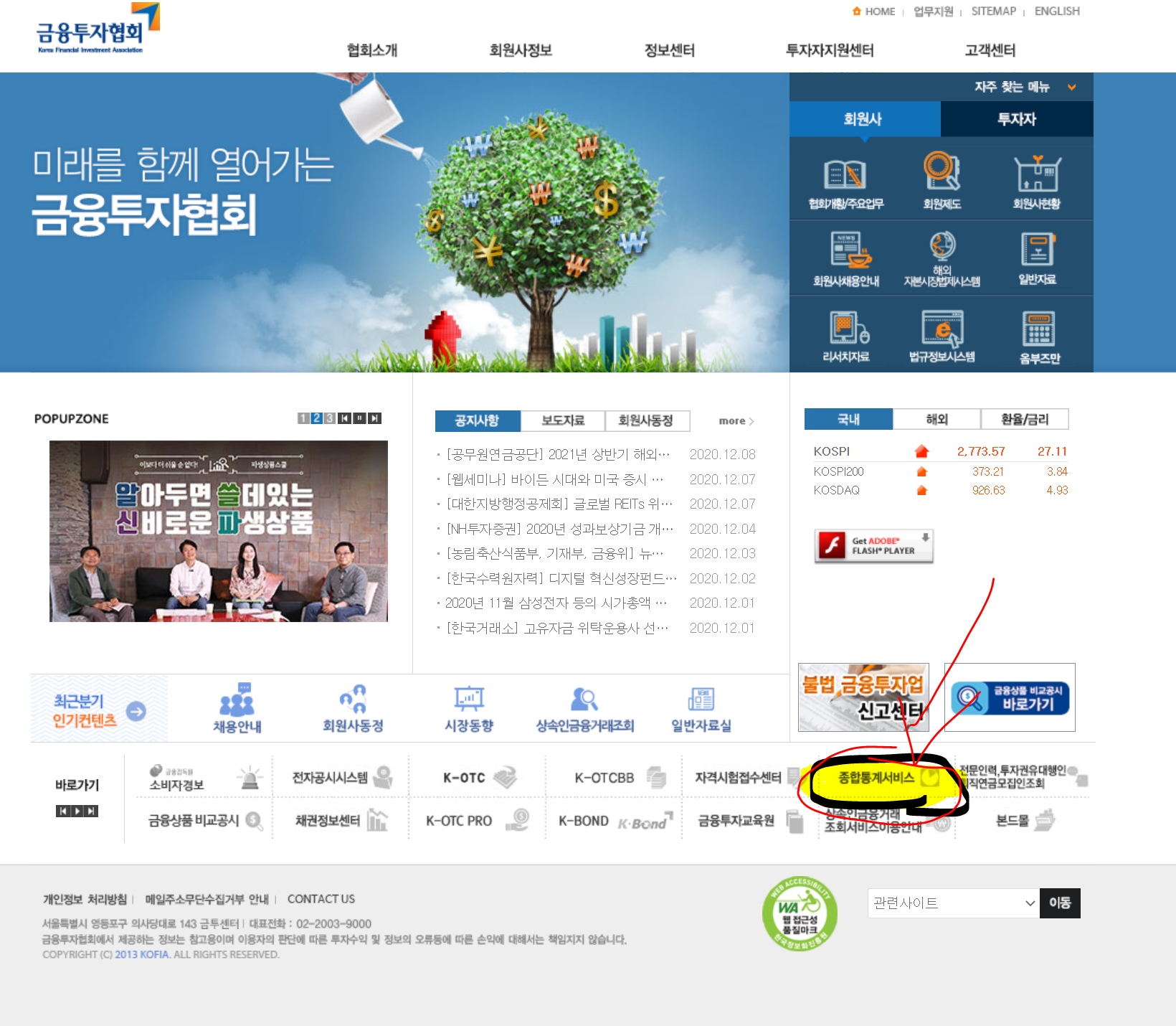 금융투자 협회 홈페이지에 들어가서 아래 바로가기의 [종합통계서비스]에 접속합니다.